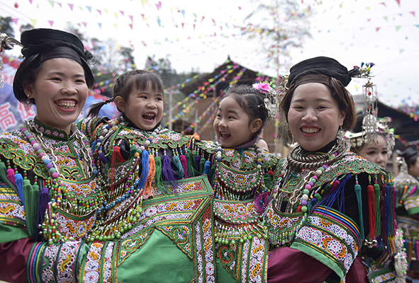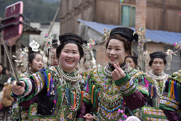 ↑在貴州省榕江縣朗洞鎮(zhèn)高便村,侗族同胞在自拍。新華社發(fā)(蔣佐仙 攝)