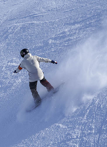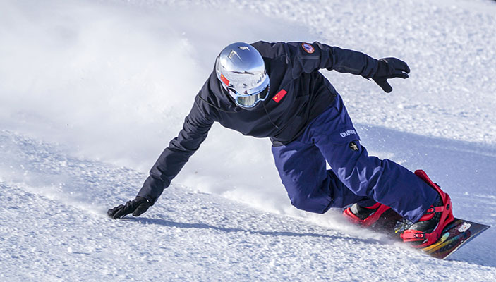 ↑2月8日,一位滑雪愛好者在絲綢之路國際滑雪場一處高級雪道上練習單板滑雪。
