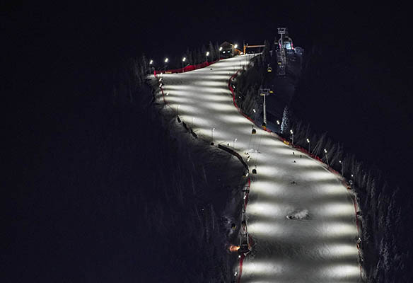 ↑2月7日,滑雪愛好者在絲綢之路國際滑雪場的夜場中練習滑雪。