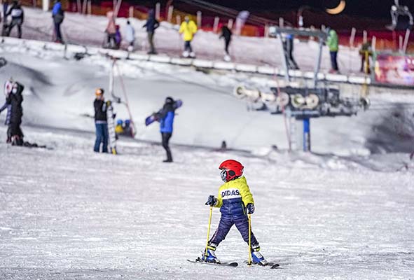 ↑2月7日,一位小朋友在絲綢之路國際滑雪場的夜場中練習滑雪。