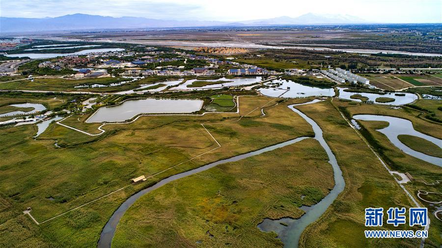這是甘肅省張掖國家濕地公園一角(2018年9月5日無人機(jī)拍攝)。新華社記者 陶明 攝