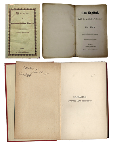 上圖為1848年《共產(chǎn)黨宣言》德文第一版。右上圖為1867年《資本論》德文第1卷第一版。下圖為恩格斯的題字贈書《社會主義從空想到科學(xué)的發(fā)展》,1892年英文版。 中央黨史和文獻(xiàn)研究院供圖