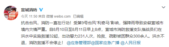 在災(zāi)情嚴(yán)重的安徽宣城,自8月10日至8月11日早上8點,宣城消防指戰(zhàn)員們在洪水中實施救援32起,出動警力231人次,搶救、疏散被困群眾300余人。洪水不退,消防救援不會停止!