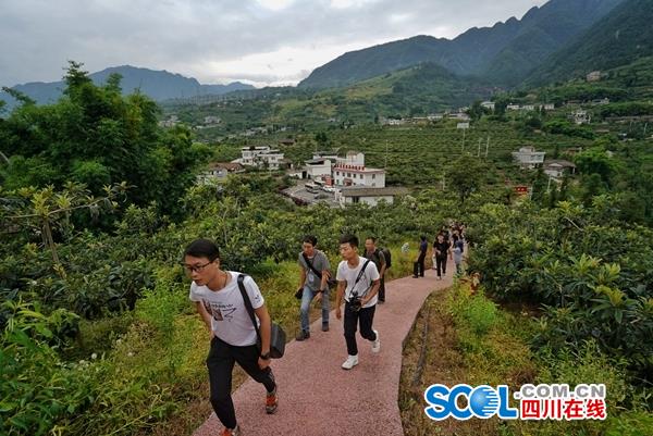 中午時(shí)分,采訪團(tuán)記者一下車,就被眼前的果樹林所震撼:青翠的果樹沿大渡河岸一線撒開,一眼望不到邊!包S果柑掛果要一年,明年3月才會(huì)成熟!蓖诮青l(xiāng)鄉(xiāng)長(zhǎng)山丹梅說(shuō),這里已發(fā)展黃果柑600畝,是石棉縣“百里金果長(zhǎng)廊”鄉(xiāng)村旅游帶重要組成部分,也是產(chǎn)村互動(dòng)共融的新農(nóng)村示范點(diǎn)。