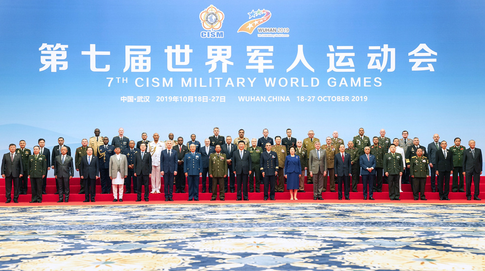 會見前,習近平同出席第七屆世界軍人運動會開幕式的各國防務部門和軍隊領導人及國際軍事體育理事會主要官員合影。