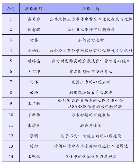 目前已確定的微課講座共計14講,均由北京林業(yè)大學心理系教師講授,包括:應對類和相關知識類等,詳情請見下表(后期還會持續(xù)增加新的講座主題,敬請關注)。