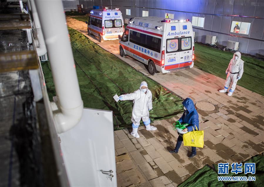 2月10日,一輛轉運車在武漢市江漢區(qū)德望社區(qū)接到一位確診患者送往“方艙醫(yī)院”。 新華社記者李賀攝