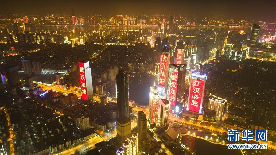 1月31日,武漢市江漢區(qū)西北湖附近高層建筑外墻打出“武漢加油”等字樣(無人機(jī)照片)。 新華社記者肖藝九攝