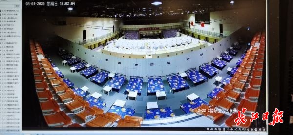 硚口武體方艙醫(yī)院休艙當(dāng)天下午6時(shí),通過監(jiān)視器里面看到的方艙醫(yī)院全景。