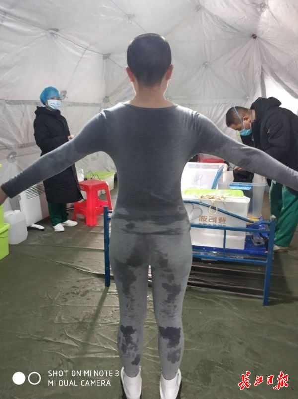 硚口武體方艙醫(yī)院,護(hù)士出艙前脫掉被污染的防護(hù)服和隔離衣,走到用帳篷搭建的清潔區(qū),用酒精進(jìn)行全身消殺處理。