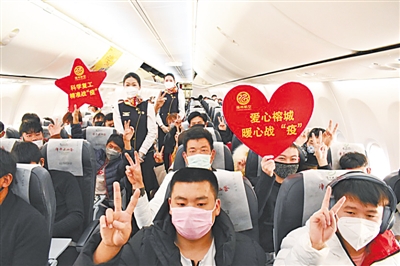 341名云南籍務(wù)工人員先乘上包機(jī)返榕。張鐵國攝/光明圖片
