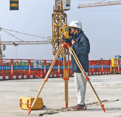鄭州南站施工現(xiàn)場,測量員正在用全站儀進(jìn)行施工點(diǎn)位測量。