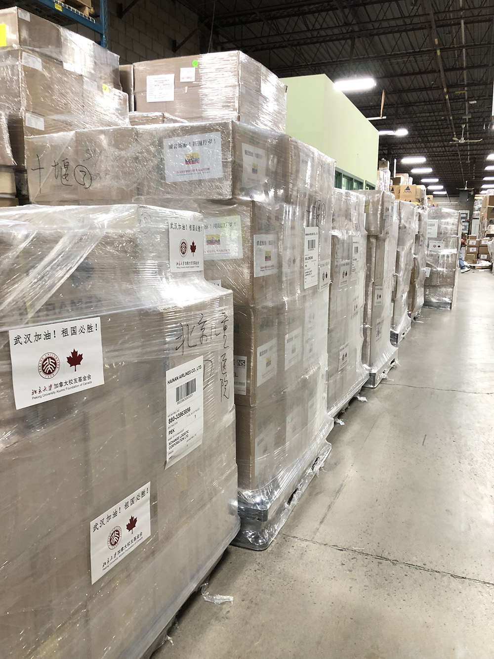 據(jù)北京大學(xué)加拿大校友基金會創(chuàng)會理事房震宇介紹,新冠肺炎疫情發(fā)生以來,北京大學(xué)加拿大校友基金會作為聯(lián)合捐贈的總協(xié)調(diào)人,在國內(nèi)航空公司和物流的支持下,累計向湖北武漢等抗疫前線醫(yī)院捐贈防護服、醫(yī)用口罩、護目鏡及醫(yī)用手套等防護物資25個航空貨運托盤,總重量超過8噸、總價值近300萬人民幣。