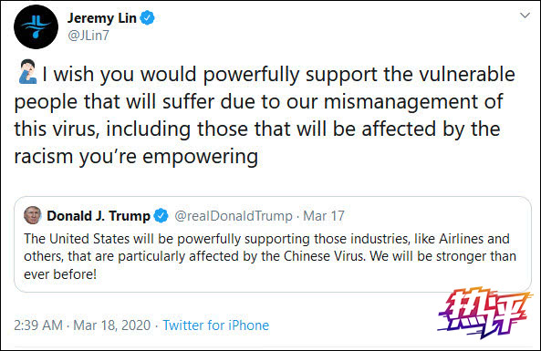 當(dāng)?shù)貢r(shí)間17日,美國(guó)總統(tǒng)特朗普公然將肆虐全球的新型冠狀病毒稱(chēng)作“中國(guó)病毒”,試圖甩鍋中國(guó)以擺脫美國(guó)內(nèi)對(duì)其抗疫不力的指責(zé)。特朗普的無(wú)底線(xiàn)言論,引起海外華僑華人的堅(jiān)決反對(duì),前NBA華裔球星林書(shū)豪也連發(fā)數(shù)條推文批評(píng)特朗普的表態(tài)帶有種族歧視含義,指責(zé)美國(guó)現(xiàn)任政府的防疫工作開(kāi)展不力。