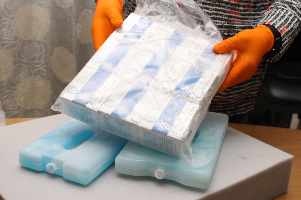 這是3月19日在貝寧經(jīng)濟首都科托努舉行的捐贈儀式上拍攝的中國向貝寧衛(wèi)生部捐贈的試劑盒。新華社發(fā)(塞拉芬攝)