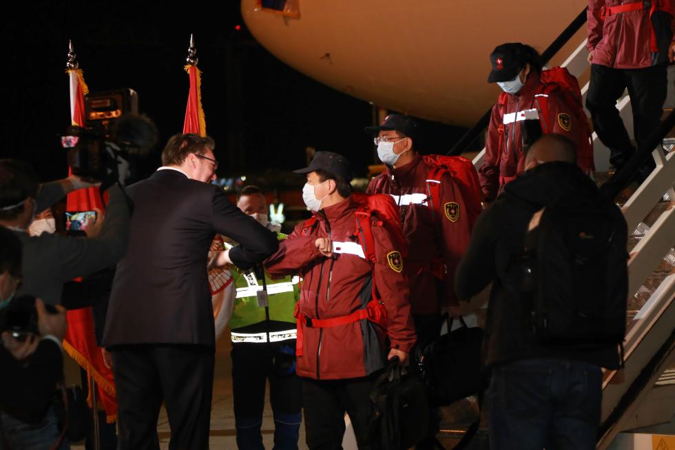 3月21日晚,夜幕中的貝爾格萊德國際機場,塞爾維亞總統(tǒng)武契奇親自在舷梯旁迎接中國抗疫醫(yī)療專家組和醫(yī)療物資。他與中國專家“碰肘”,又深情親吻一旁的五星紅旗。
