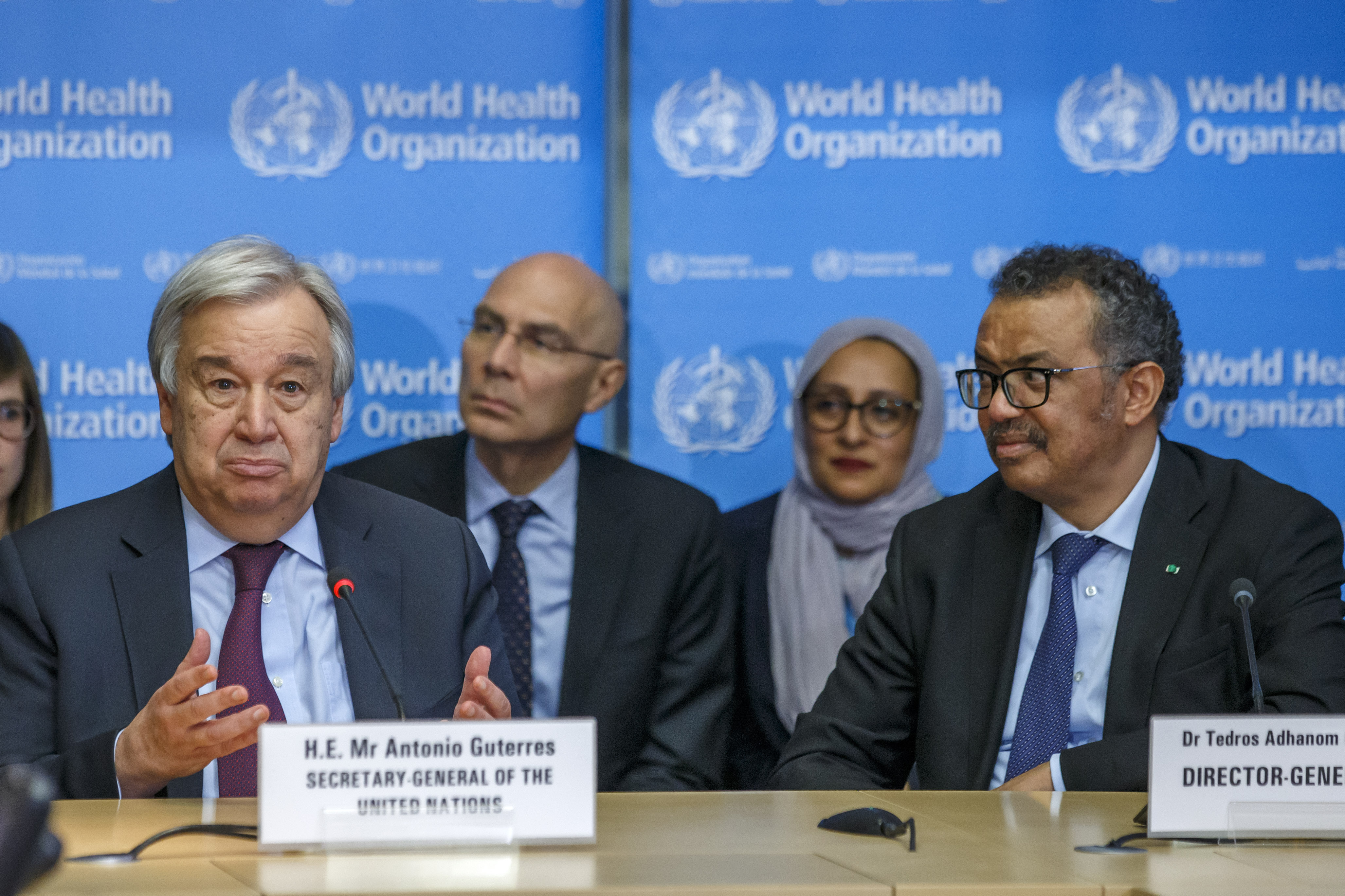 2月24日,在瑞士日內(nèi)瓦,聯(lián)合國秘書長古特雷斯(左)在世界衛(wèi)生組織總部發(fā)表講話。古特雷斯表示,中國人民為盡量減輕新冠肺炎疫情造成的負(fù)面影響,實施嚴(yán)格的防控措施,以犧牲正常生活的方式為全人類做出了貢獻。新華社發(fā)