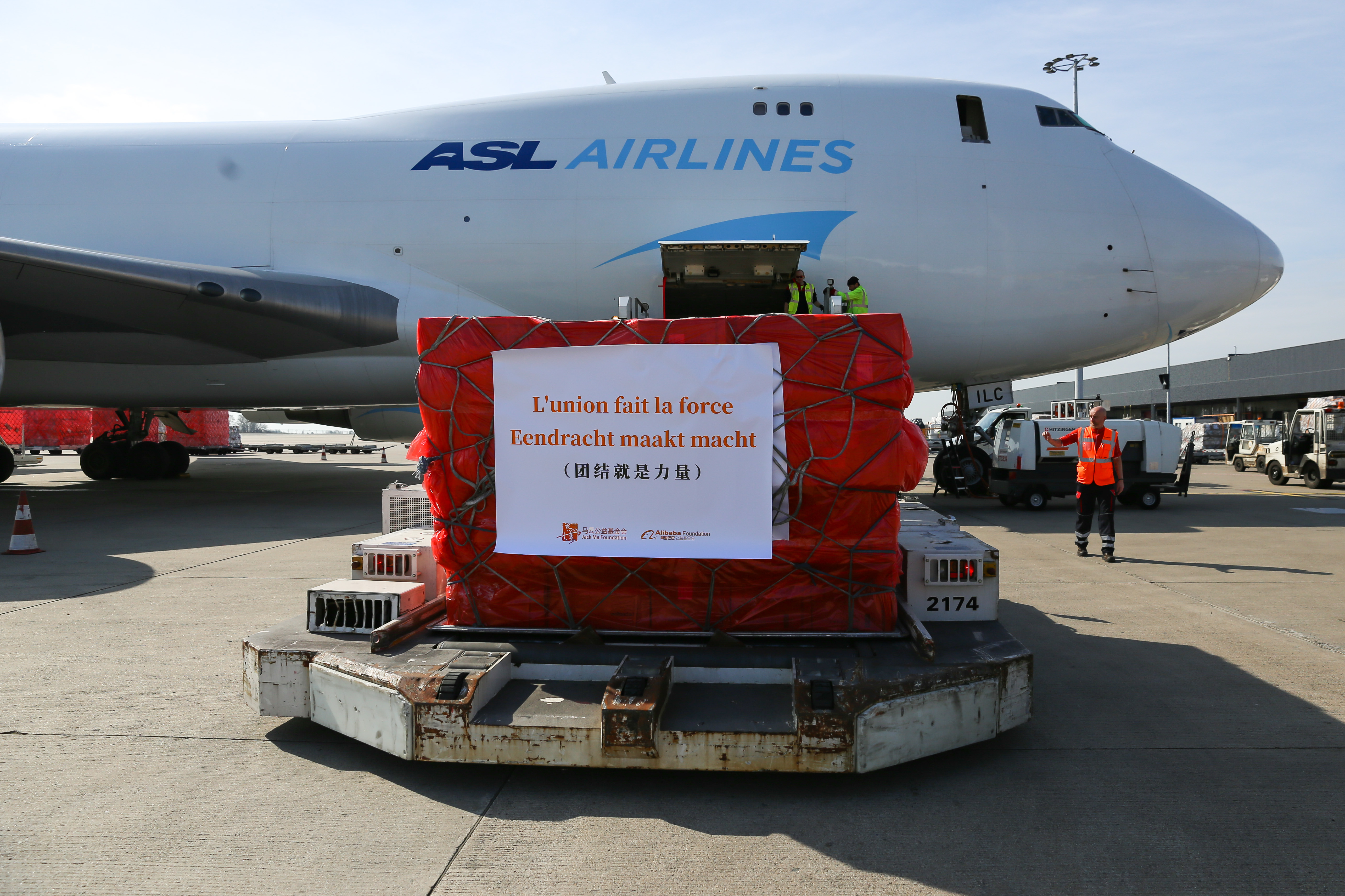 3月16日,在比利時列日機場,工作人員運送口罩包裹。來自中國的30萬只口罩當(dāng)?shù)貢r間16日中午運抵比利時列日機場。這是歐洲新冠肺炎疫情暴發(fā)以來,比利時首次得到大規(guī)模外來援助。這批物資由阿里巴巴公益基金會和馬云公益基金會提供。新華社記者 張鋮 攝