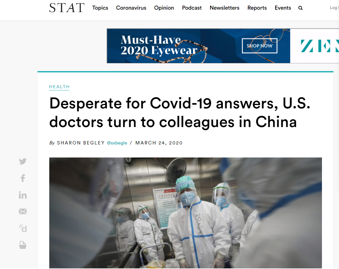 這是來(lái)自美國(guó)《波士頓環(huán)球報(bào)》旗下健康新聞網(wǎng)站STAT的一篇題為《渴望獲得新冠肺炎病毒信息 美國(guó)醫(yī)生求助中國(guó)的同行》的文章的開(kāi)篇