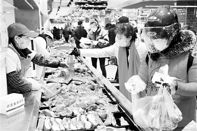 近來,各地采取多種措施,在疫情防控期間保障豬肉市場供應(yīng),滿足居民消費(fèi)需求。圖為市民在河南省鄭州市一家大型超市內(nèi)采購豬肉。
