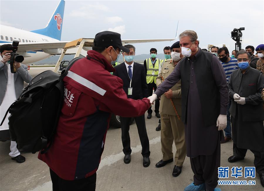 3月28日,在巴基斯坦伊斯蘭堡國際機(jī)場,巴基斯坦外長庫雷希(前右)與剛剛抵達(dá)的中國政府赴巴基斯坦抗疫醫(yī)療專家組成員握手。 新冠肺炎疫情發(fā)生以來,習(xí)近平主席時刻關(guān)注國內(nèi)外疫情形勢,高度重視抗疫國際合作,多次作出重要指示批示,頻頻開展元首外交,從構(gòu)建人類命運共同體高度,親自推動疫情防控國際合作。 新華社記者 劉天 攝