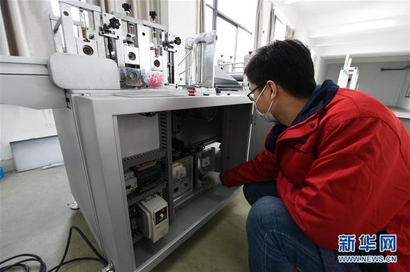 在合肥奧瑞數(shù)控科技有限公司技術(shù)研發(fā)車間,工作人員對新研制的N95口罩機進(jìn)行最后的調(diào)試(3月12日攝)。新華社發(fā)(周牧 攝)