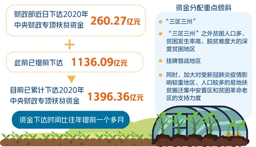 如期高質(zhì)量打贏脫貧攻堅戰(zhàn),資金保障十分重要。近日,財政部下達各地2020年中央財政專項扶貧資金260.27億元,加上提前下達的資金,目前已累計下達2020年中央財政專項扶貧資金1396.36億元,下達時間比往年提前一個多月。