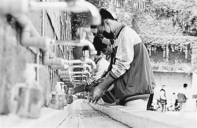 2020年4月7日,四川省返校學生在飯前用七步洗手法進行消毒。蔣永平攝/光明圖片