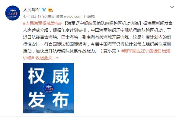 中國(guó)臺(tái)灣網(wǎng)4月14日北京訊 4月13日,據(jù)海軍新聞發(fā)言人高秀成介紹,根據(jù)年度計(jì)劃安排,中國(guó)海軍組織遼寧艦航母編隊(duì)跨區(qū)機(jī)動(dòng),于近日航經(jīng)宮古海峽、巴士海峽,到南海有關(guān)海域開(kāi)展訓(xùn)練,這是年度計(jì)劃內(nèi)的例行性安排,符合國(guó)際法和國(guó)際慣例,今后中國(guó)海軍仍將按計(jì)劃常態(tài)組織類(lèi)似演訓(xùn)活動(dòng),加快提升航母編隊(duì)體系作戰(zhàn)能力。(完)