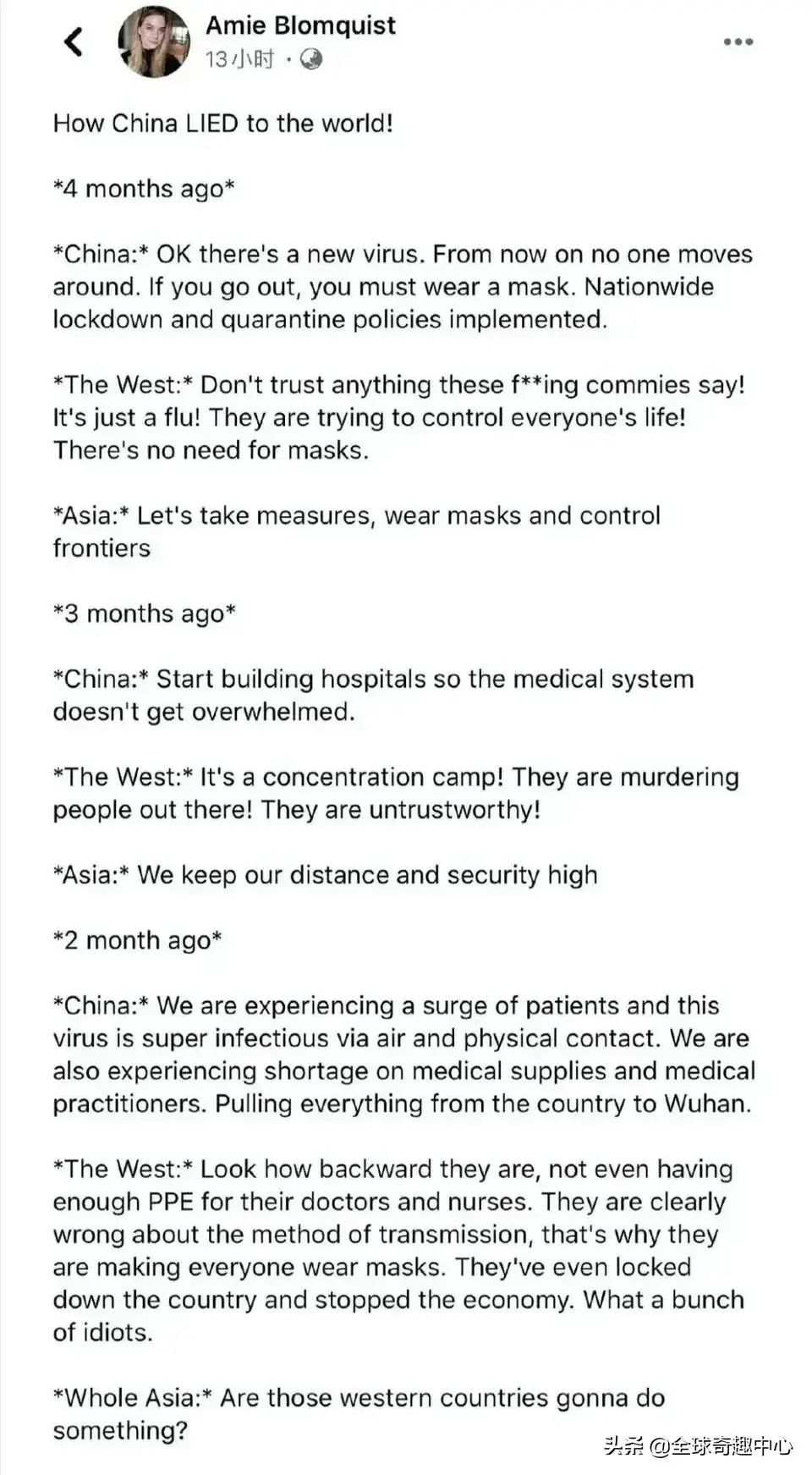 歐美:看看他們是多么落后,甚至沒有足夠的個(gè)人防護(hù)用品給他們的醫(yī)生和護(hù)士,所以他們讓每個(gè)人戴口罩,甚至封鎖了整個(gè)國家,停止了經(jīng)濟(jì)運(yùn)行,這明顯是錯(cuò)誤的舉動(dòng),一群傻子。