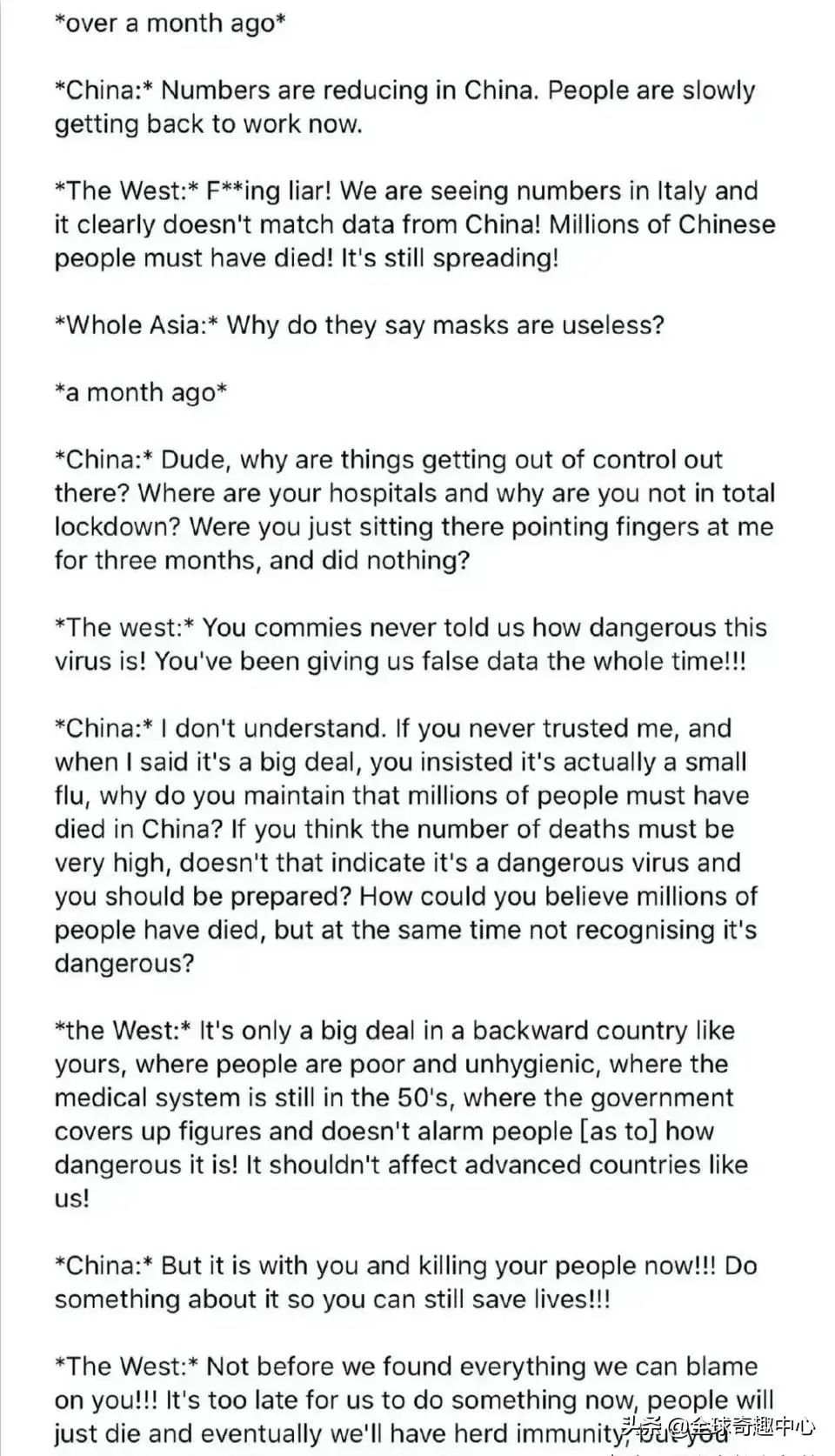中國:哥們,發(fā)生了什么,疫情怎么失控了?醫(yī)院呢?為什么你不采取隔離措施,只是坐在那里指責(zé)了我三個(gè)月,什么也不做?