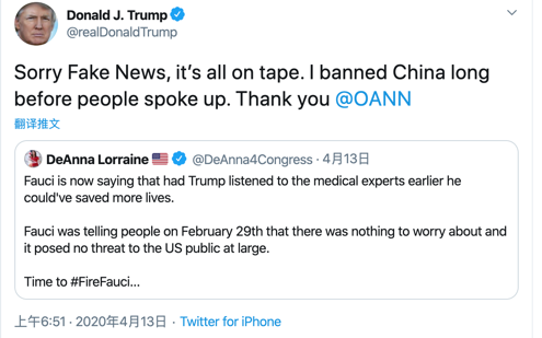 特朗普也立刻轉(zhuǎn)發(fā)了這條帶有#解雇福奇#話題的推特,并評(píng)論:“不好意思,假新聞們,這些都有據(jù)可查,我很早就對(duì)中國下了旅行禁令了 ”,以此證明自己并沒有延誤疫情應(yīng)對(duì)的時(shí)機(jī)。