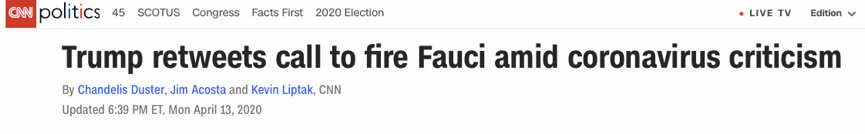 特朗普的這條轉(zhuǎn)推立刻引起媒體關(guān)注,美國有線電視新聞網(wǎng)(CNN)報(bào)道稱“特朗普轉(zhuǎn)發(fā)要求解雇福奇的推特”。《華盛頓郵報(bào)》稱“#解雇福奇#標(biāo)志著甩鍋游戲(blame game)全面啟動(dòng)”。