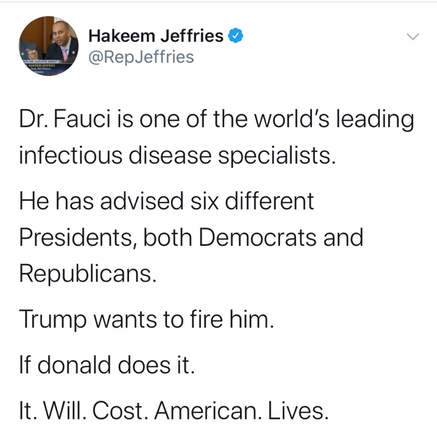 有人憤慨地表示:“福奇博士是世界最優(yōu)秀的傳染病專家之一,他給六位總統(tǒng)做過顧問,民主黨和共和黨的都有,而特朗普想要炒掉他。如果特朗普真這樣干,那付出的是美國人生命的代價(jià)!薄