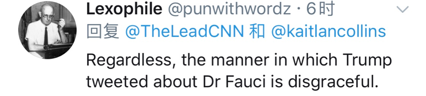 有網(wǎng)民批判特朗普轉(zhuǎn)發(fā)話題的不恰當(dāng)行為:“無論如何,特朗普這樣轉(zhuǎn)發(fā)福奇的話題真是上不了臺(tái)面。”↓↓