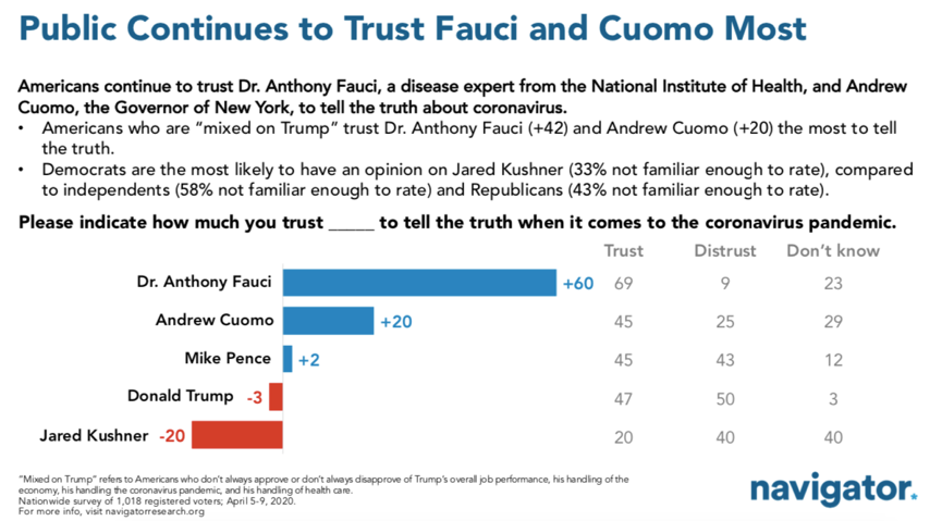 美國民調(diào)機(jī)構(gòu)“領(lǐng)航員”(Navigator)4月10日發(fā)布的調(diào)查結(jié)果顯示,美國人在疫情中更信任福奇而非特朗普,在這份調(diào)查中,福奇以60分排名第一,特朗普只得到-3分,倒數(shù)第二。墊底的則是特朗普的女婿賈里德·庫什納。