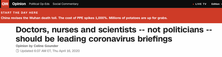 16日,CNN評(píng)論員、傳染病專家席琳·岡德發(fā)文稱,應(yīng)該讓醫(yī)護(hù)人員和科學(xué)家主導(dǎo)疫情簡(jiǎn)報(bào)會(huì),而不是政客們:“我認(rèn)為醫(yī)護(hù)人員和科學(xué)家應(yīng)該站在傳播疫情信息的第一線!