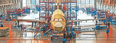 3月6日,工人在中國商飛上海飛機(jī)制造有限公司的生產(chǎn)車間內(nèi)作業(yè)。