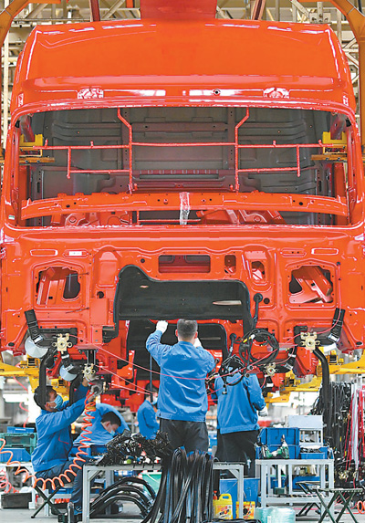 4月23日,工人在陜西汽車控股集團(tuán)有限公司重卡總裝線工作。