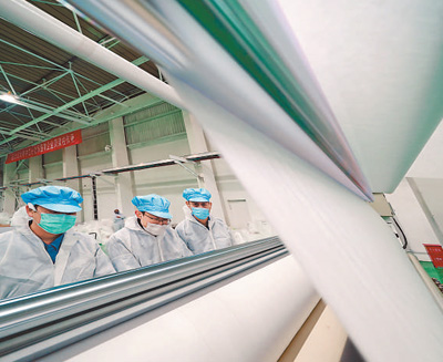 4月23日,燕山石化工人正在熔噴無紡布生產(chǎn)線上工作,該生產(chǎn)線僅用時(shí)12天就建成投產(chǎn)。