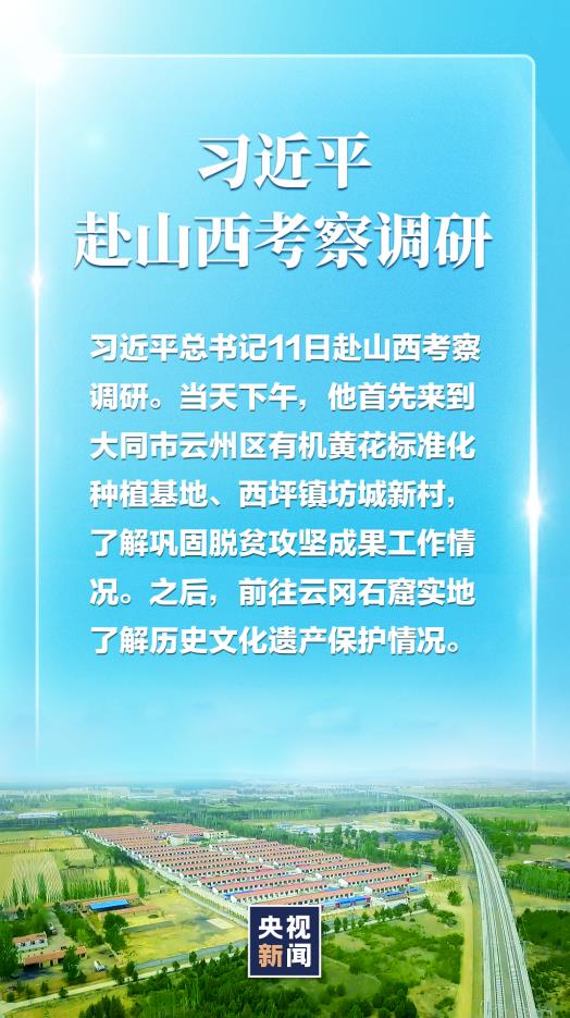 習(xí)近平總書(shū)記11日赴山西考察調(diào)研。當(dāng)天下午,他首先來(lái)到大同市云州區(qū)有機(jī)黃花標(biāo)準(zhǔn)化種植基地、西坪鎮(zhèn)坊城新村,了解鞏固脫貧攻堅(jiān)成果工作情況。之后,前往云岡石窟實(shí)地了解歷史文化遺產(chǎn)保護(hù)情況。
