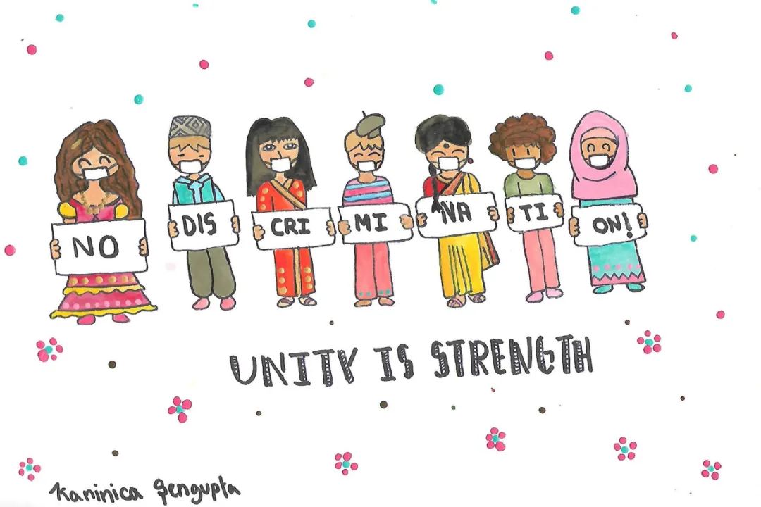 兒基會圖片丨來自印度的12歲女孩卡尼妮卡繪制的畫作,呼吁杜絕歧視,團(tuán)結(jié)抗疫