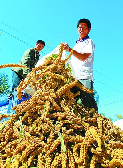 朝陽市朝陽縣勝利鎮(zhèn)吳家杖子村村民收獲金燦燦的谷穗。仇一軍攝
