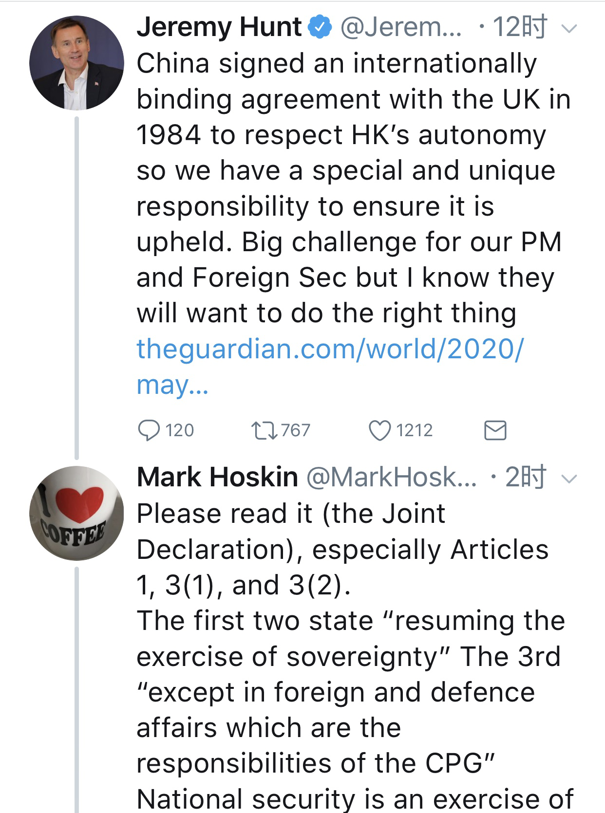 一位英國歷史研究者在社交媒體上提醒對香港事務(wù)嘰嘰歪歪的英國前外交大臣,請他仔細讀讀中英聯(lián)合聲明。其中第一章第一條款就寫著:“中華人民共和國政府聲明,收回香港地區(qū)(包括香港島九龍和新界,以下稱香港)是全中國人民的共同愿望,中華人民共和國政府決定于1997年7月1日對香港恢復(fù)行使主權(quán)!