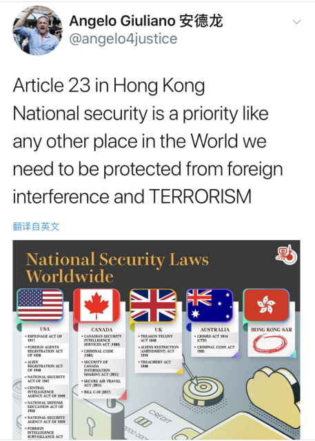 一位定居在香港的瑞士籍人士Angelo Giuliano(中文名安德龍)在社交媒體上發(fā)推表示:“就像這世界上所有地方一樣,針對香港的國安立法是最首要的,該法律能夠保護我們不受外國干涉和恐怖主義的威脅!