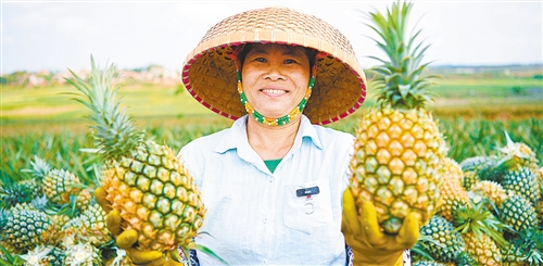 廣東徐聞縣曲界鎮(zhèn)韓宅村村民展示剛采摘的菠蘿。當(dāng)?shù)厥遣ぬ}生產(chǎn)大縣,村民通過(guò)種植菠蘿增收致富!∴ 華攝(新華社發(fā))