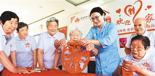 在河北省邢臺(tái)市威縣章臺(tái)鎮(zhèn)一家養(yǎng)老院,院長(zhǎng)楊瑞美和老人一起剪窗花!≈煨駯|攝(新華社發(fā))