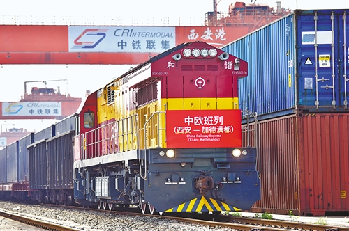 5月22日,陜西首趟開(kāi)往南亞國(guó)家的貨運(yùn)班列,從西安新筑車(chē)站出發(fā),駛向尼泊爾加德滿(mǎn)都。唐振江攝(中經(jīng)視覺(jué))