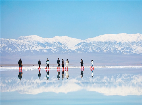 游客在位于青海省海西蒙古族藏族自治州烏蘭縣茶卡鎮(zhèn)的茶卡鹽湖景區(qū)拍照。