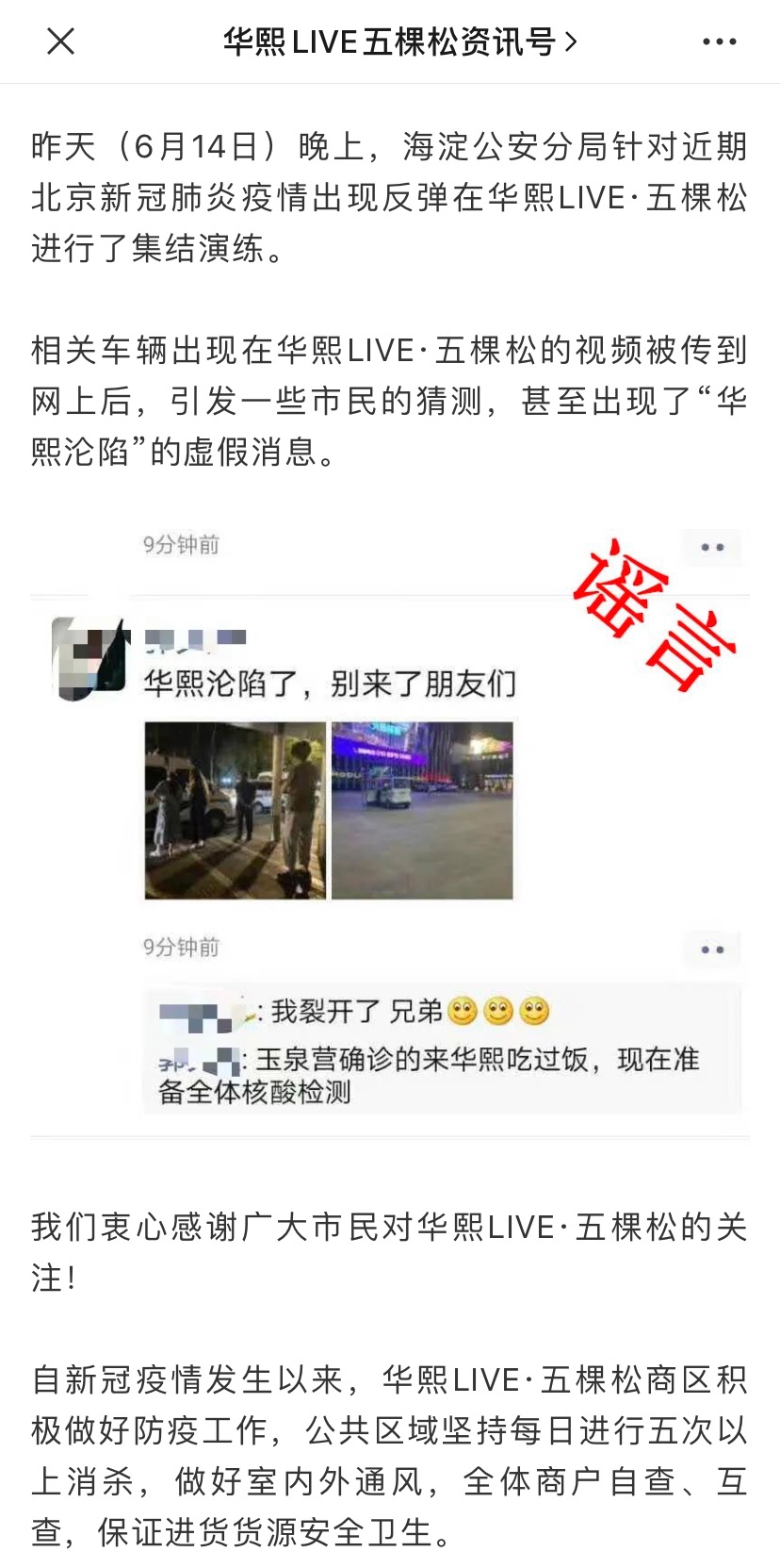6月15日,華熙Live官方微信發(fā)布通告辟謠“淪陷”傳言稱,華熙Live為配合海淀公安分局集結(jié)演練提供場地,“華熙淪陷”屬謠言。